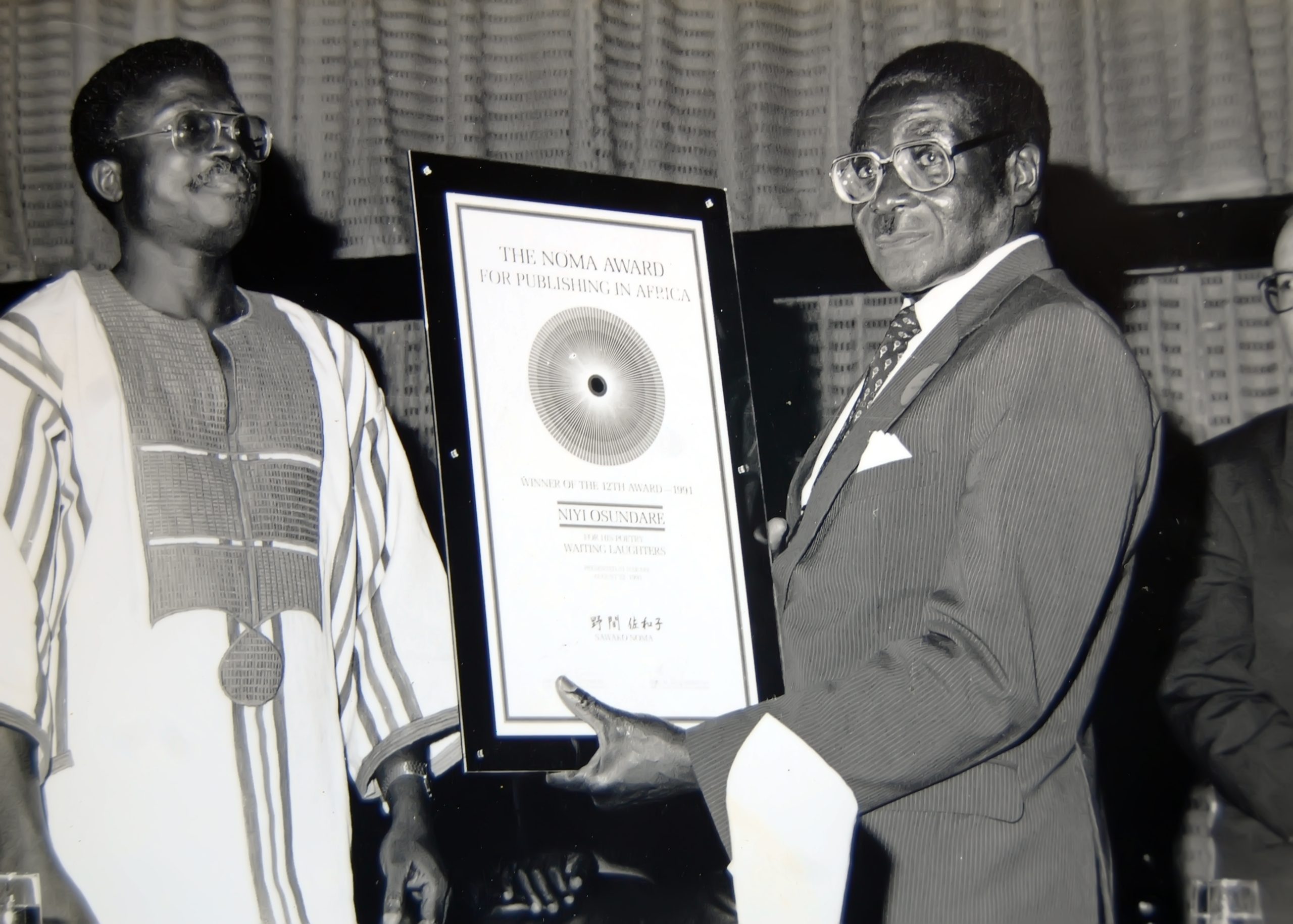 Osundare being presented with the Noma Award by President Robert Mugabe, Harare, Zimbabwe, 1991