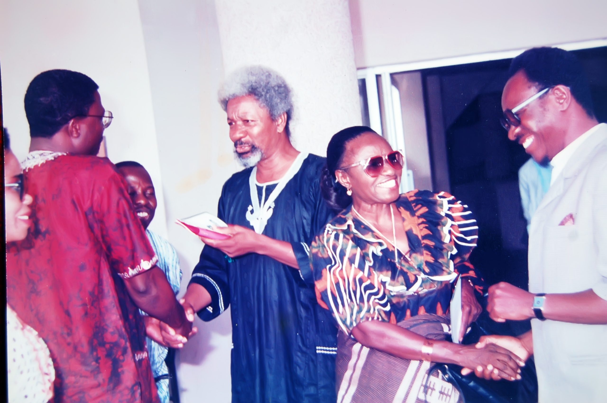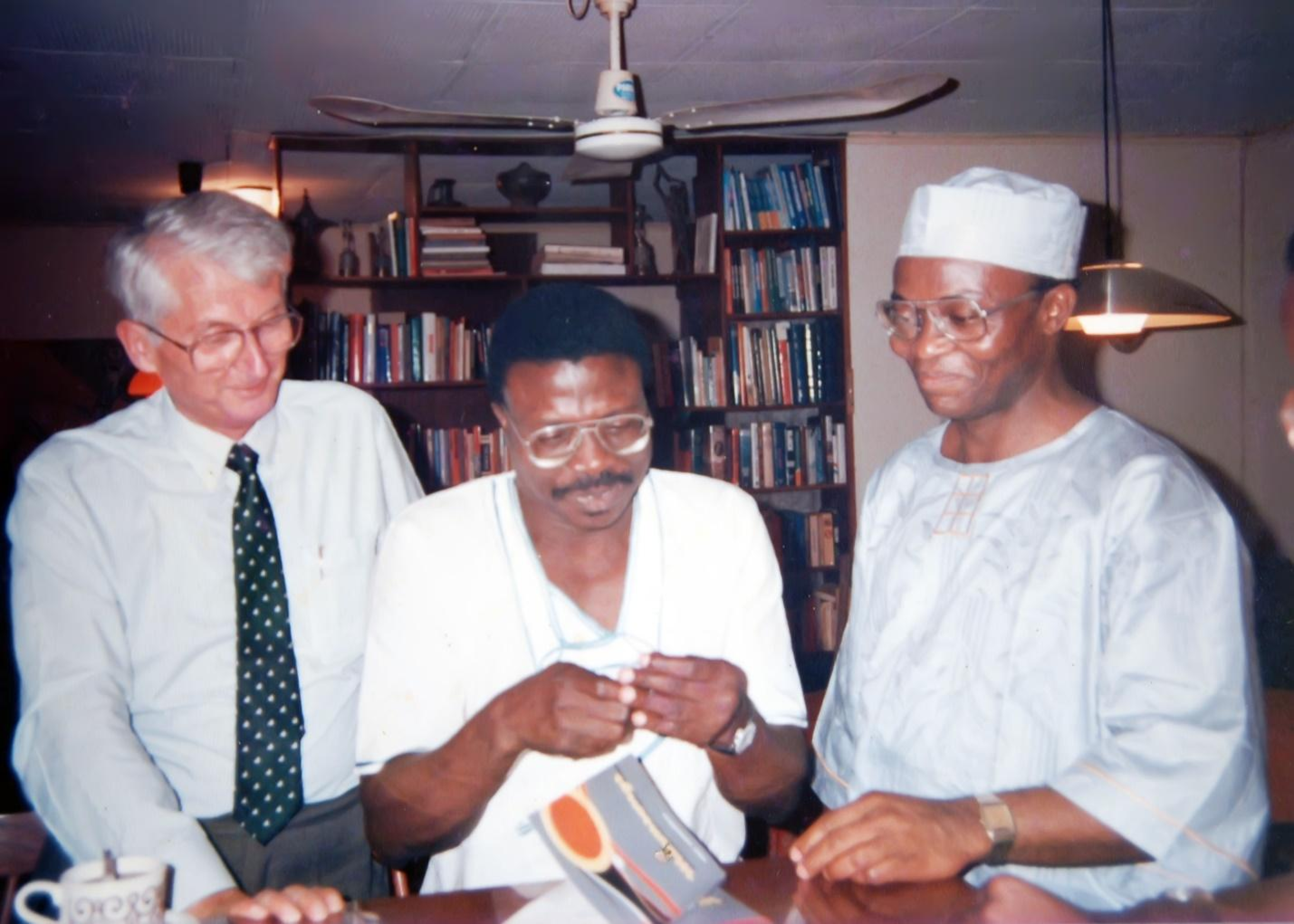 Osundare at the first book-signing of Moonsongs. To the left, Joop Berkhout, the book’s publisher; first on the right is Mr. Akin Thomas, noted Nigerian publisher, 1988