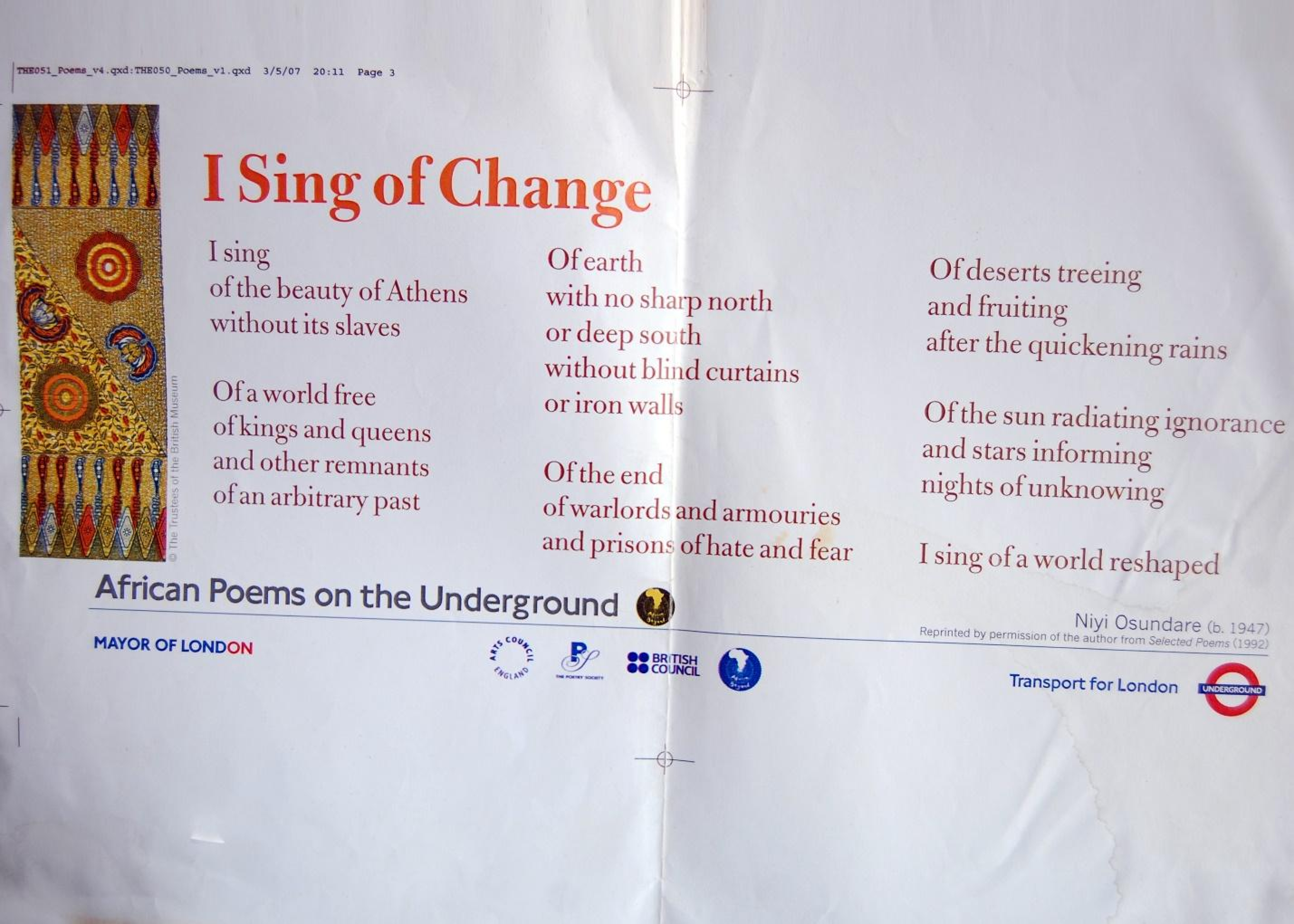 I Sing of Change’, one of Osundare’s most anthologized poems, as it appeared on the London tube, UK